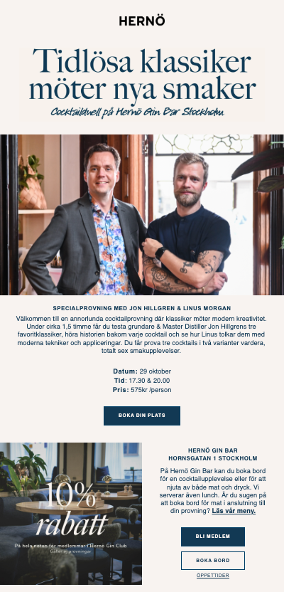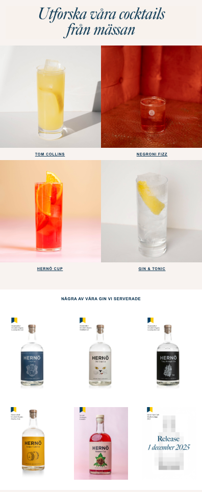 Teamet på Hernö Gin är väldigt selektiva med vad det skickar ut till sin målgrupp. Nyhetsbreven fungerar som en förlängning av varumärket. Målet är att inspirera, bygga relationer och driva merförsäljning. Varje utskick är visuellt genomtänkt, intuitivt och klickvänligt. Genom att följa upp statistik och klickbeteenden, ser de exakt vad prenumeranterna uppskattar mest och anpassar innehållet därefter.