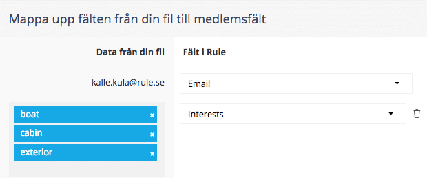 I exemplet så är kundens användningsområden cabin, boat och exterior och Kalles alla intressen kommer i samband med importen samlas under medlemsfältet Interests.